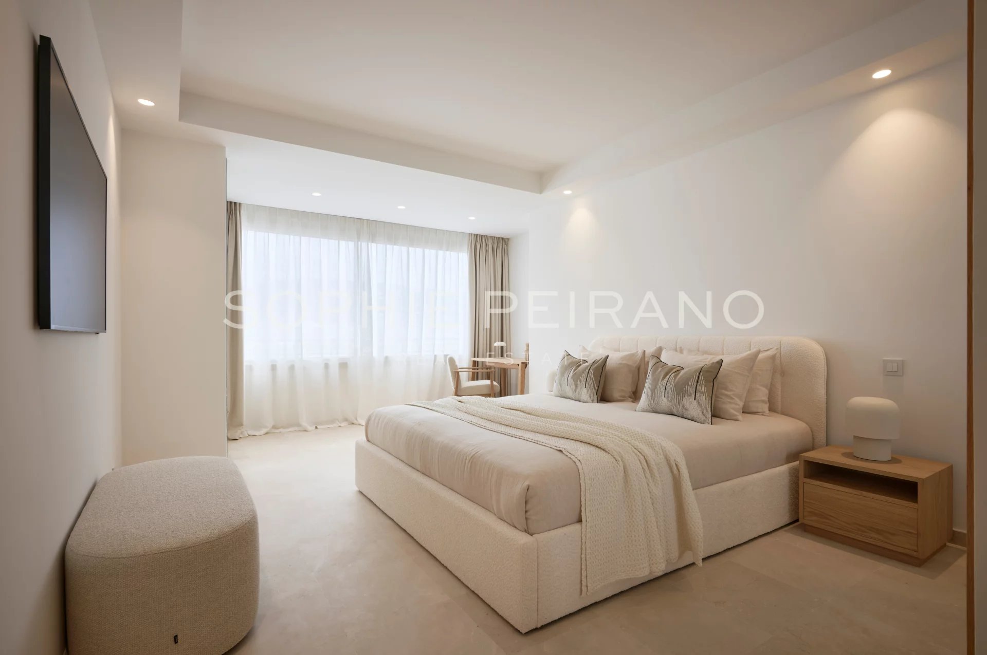 Just a few steps from La Croisette, discover this 125 sqm apartment located on the 8th floor of a highly sought-after residence, fully renovated with high-end finishes and generous volumes. It features two en-suite bedrooms, each with its own dressing room.