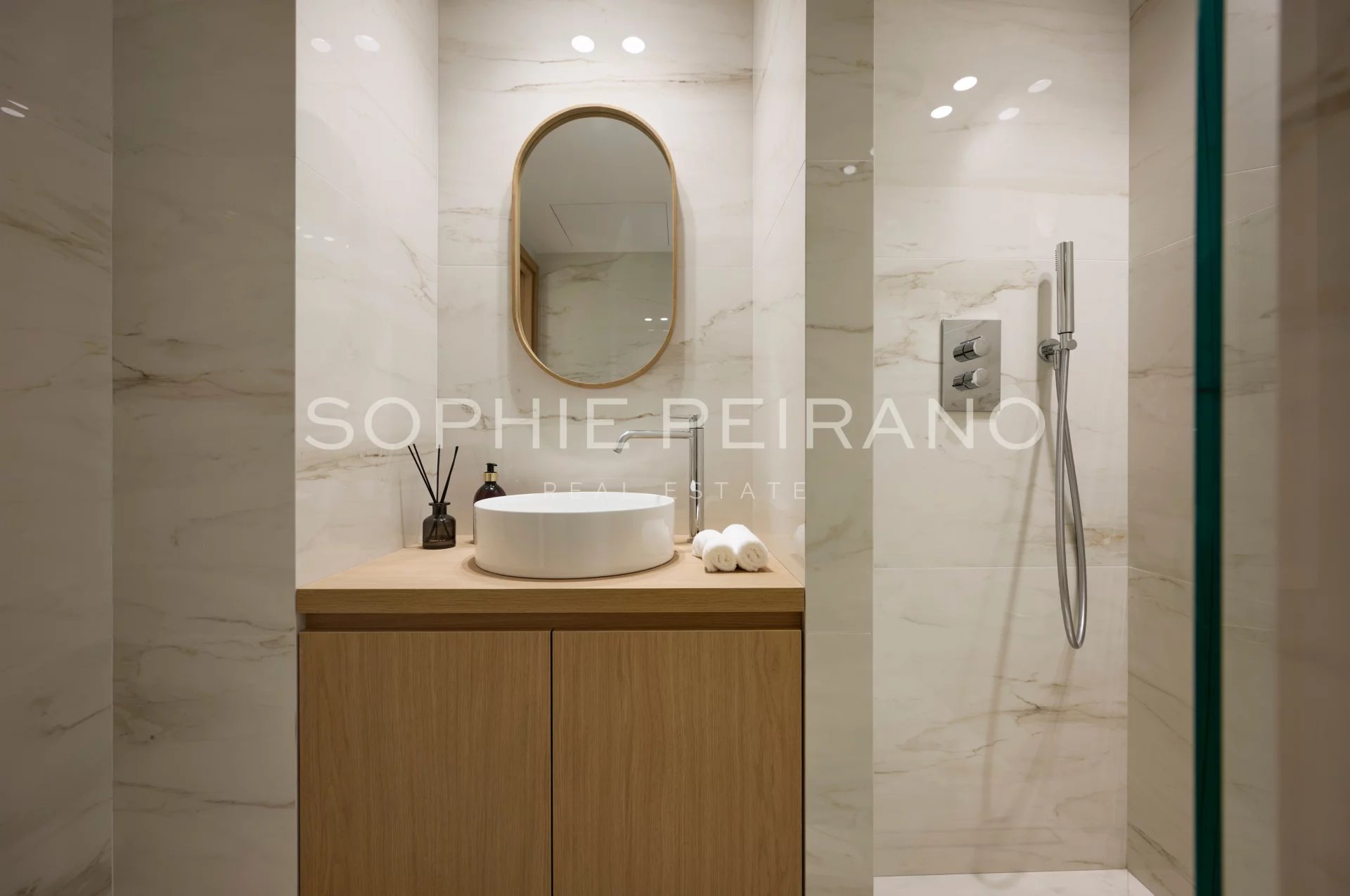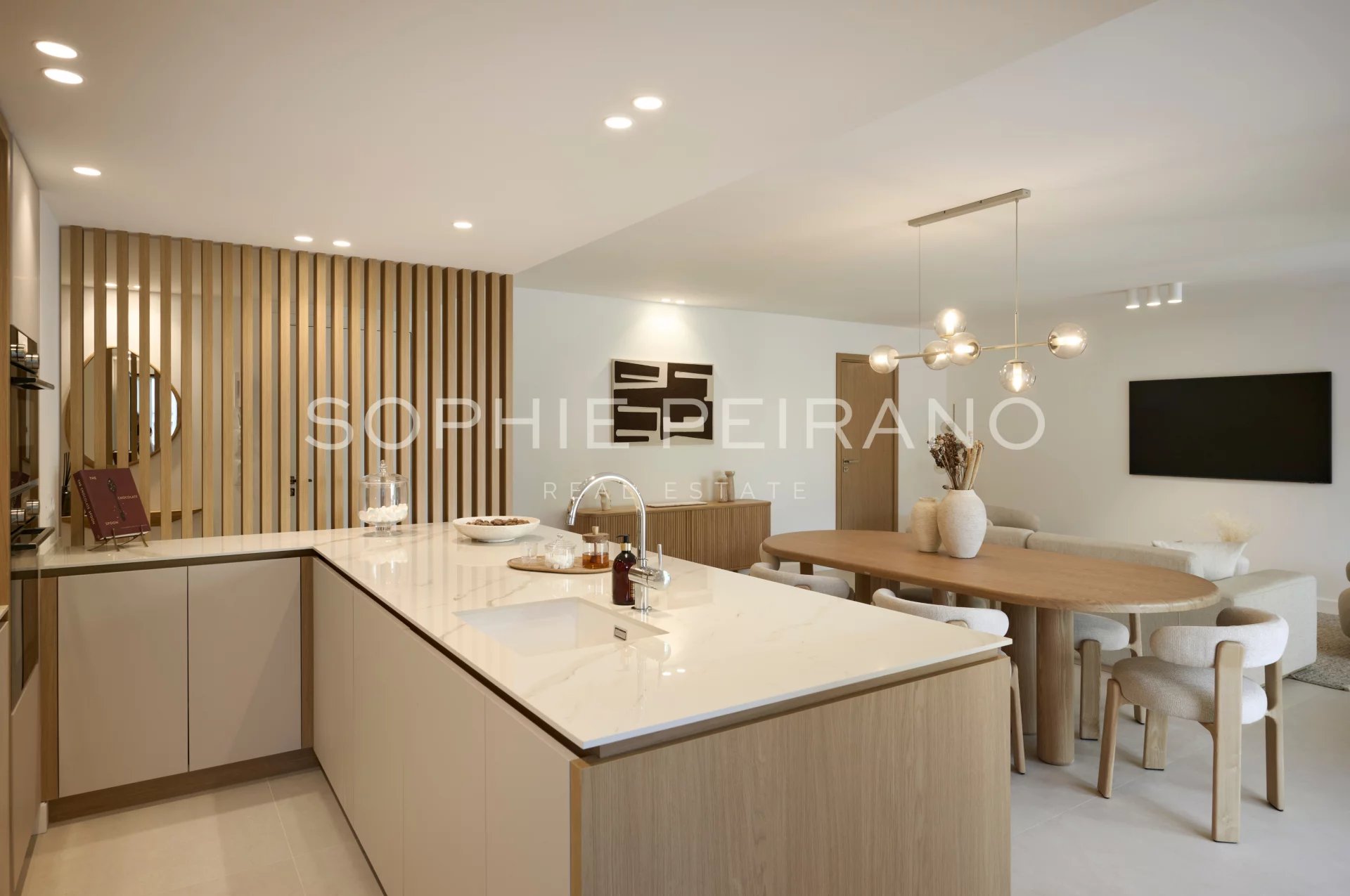 The apartment opens onto a spacious south-facing terrace of 75 sqm, perfect for enjoying the sunshine of the French Riviera. It features an entrance hall, a bright living room with dining area, a fully equipped open-plan kitchen, a laundry area, and three en-suite bedrooms, each with its own dressing room.