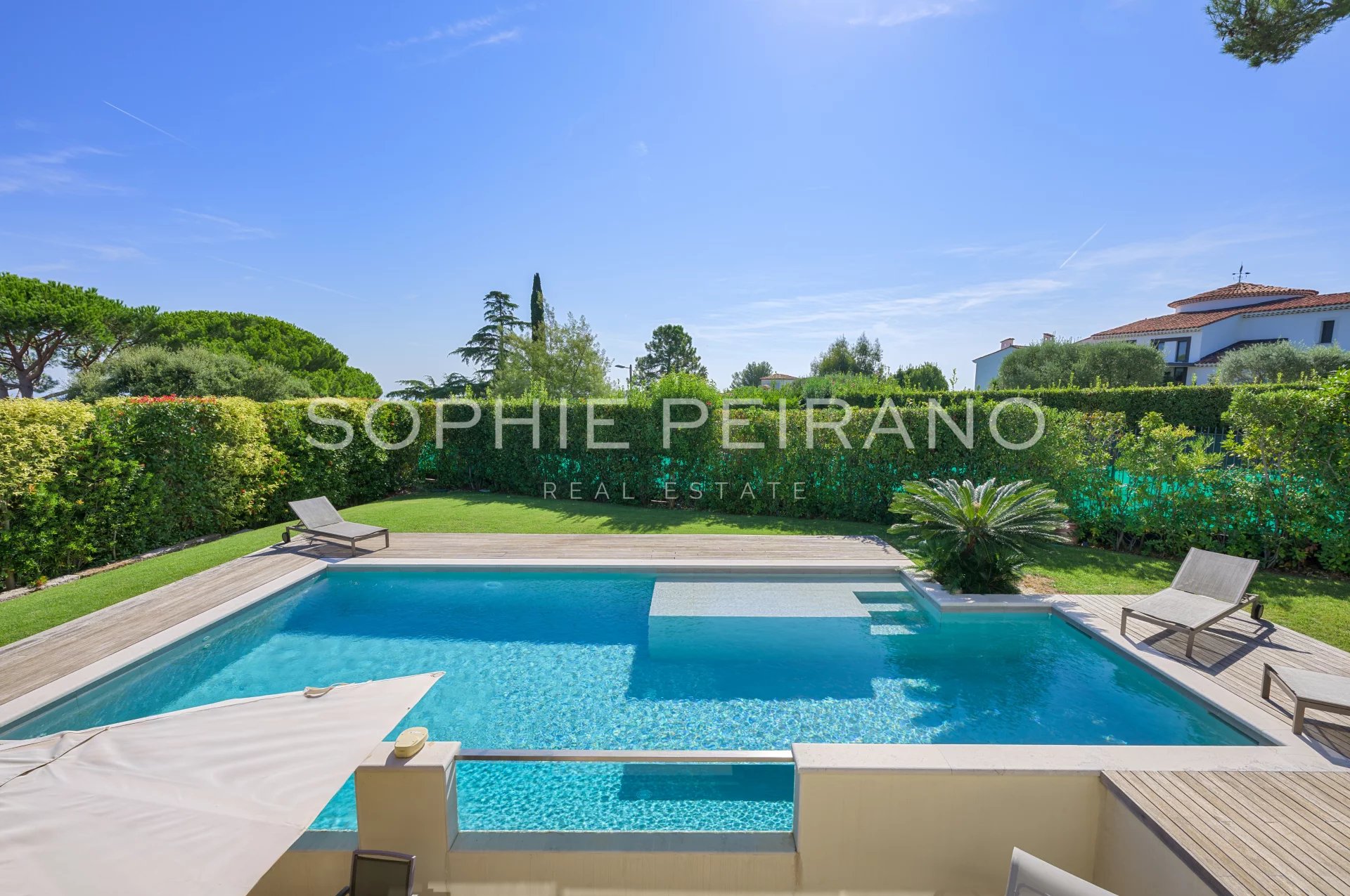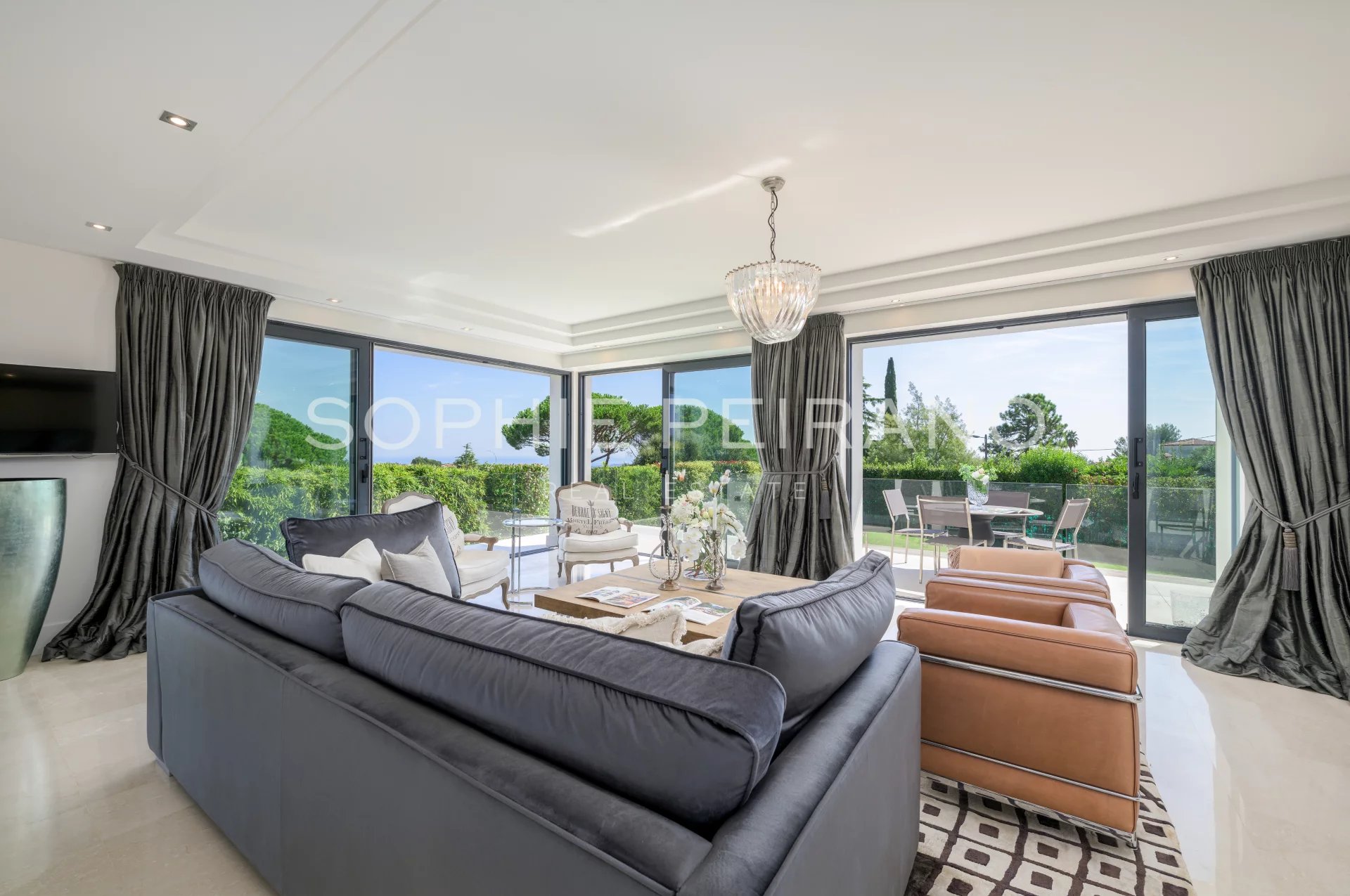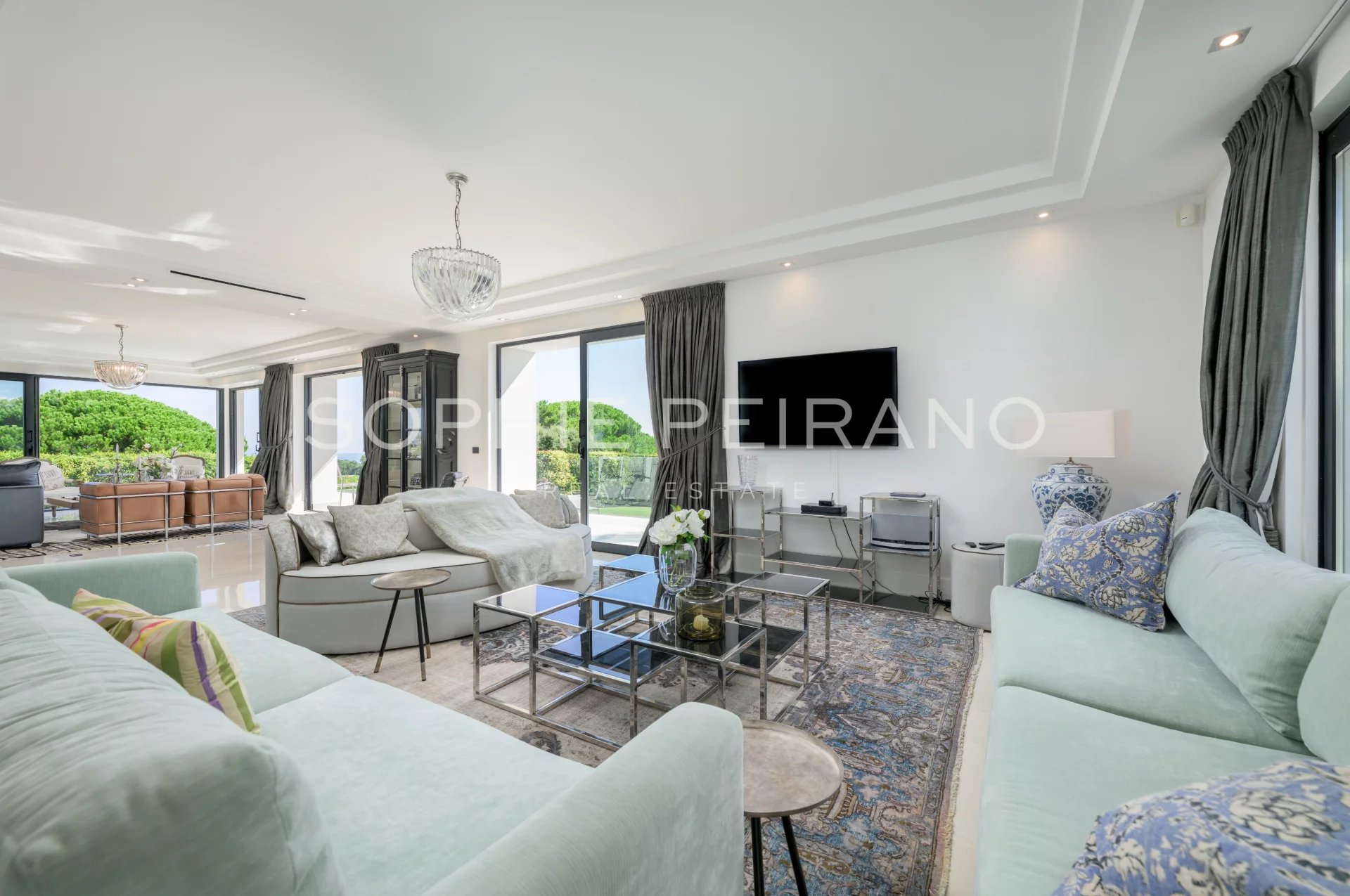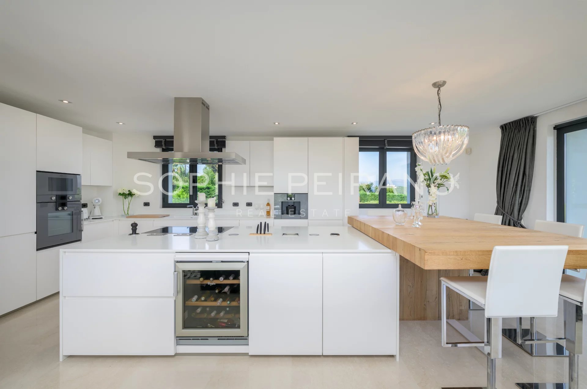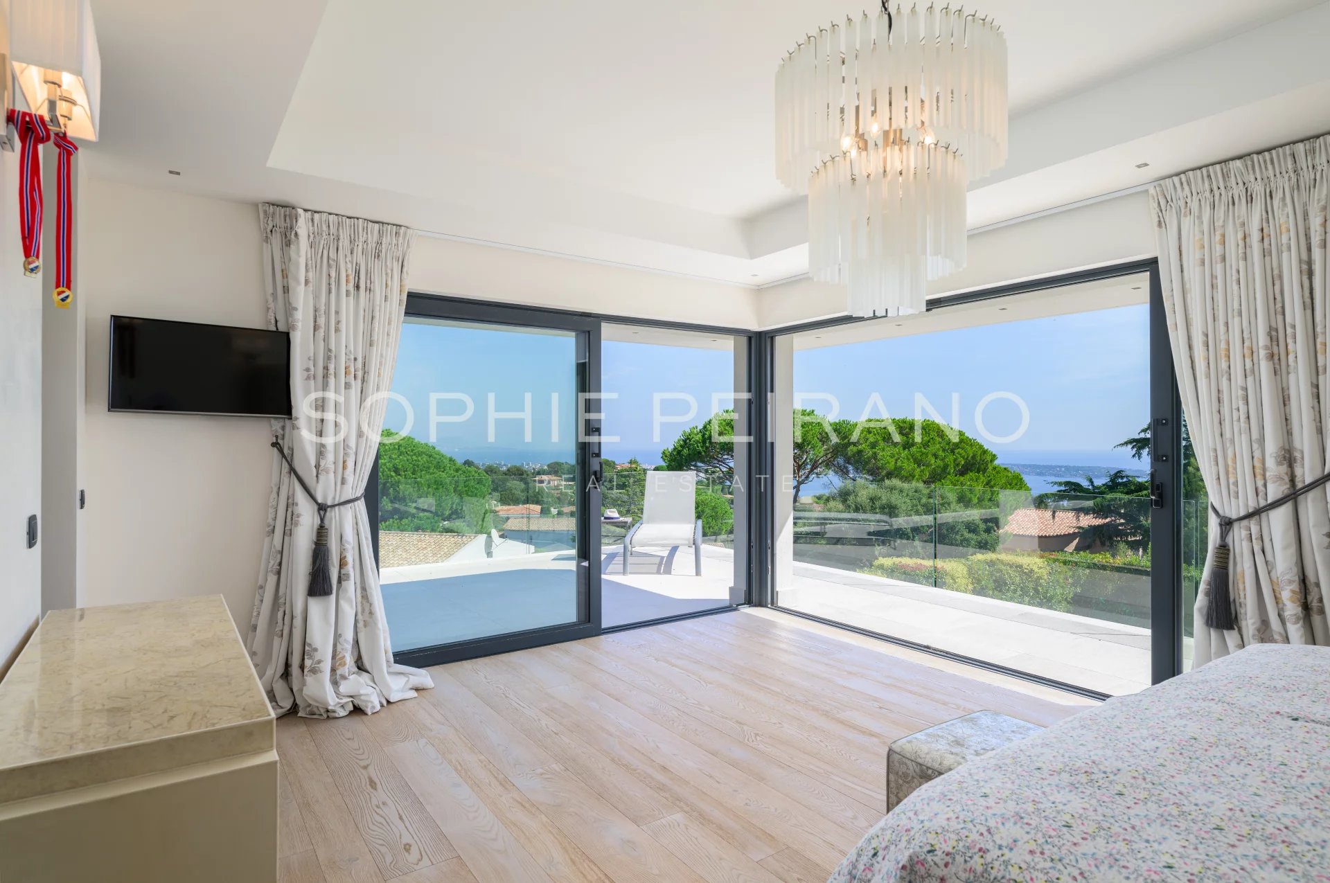 Located in the prestigious area of Super Cannes, this contemporary villa in a dominant position offers 180° sea views. With approximately 360 m² of living space, the villa features spacious reception areas including a living room, dining area and open-plan kitchen opening onto a south-facing terrace with views over the sea, the garden and the swimming pool.