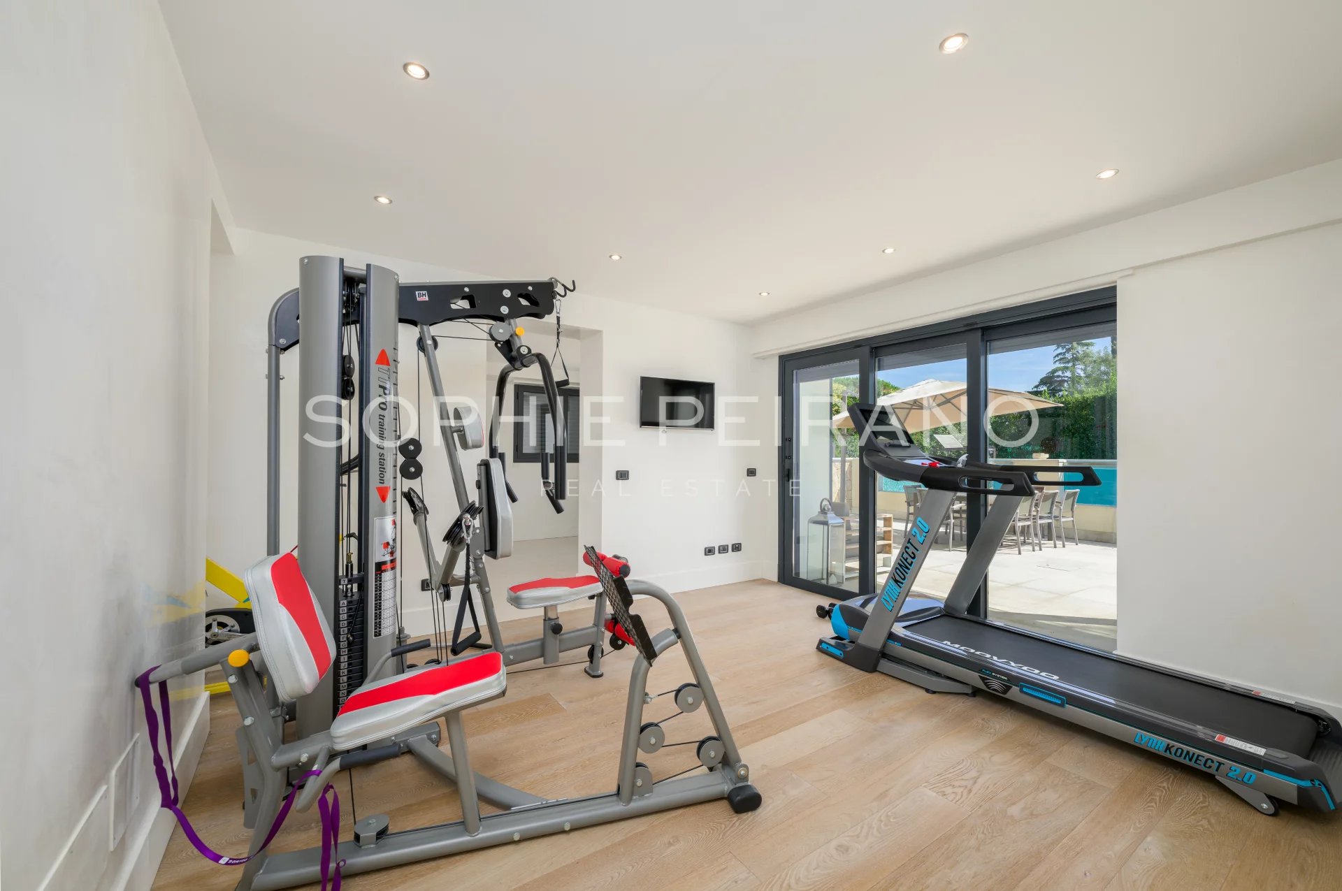 The garden level includes a bedroom with direct access to the terrace and swimming pool, a gym, a cinema room, a laundry room, a kitchen, as well as an independent studio with living room and kitchen, a bedroom and a shower room.