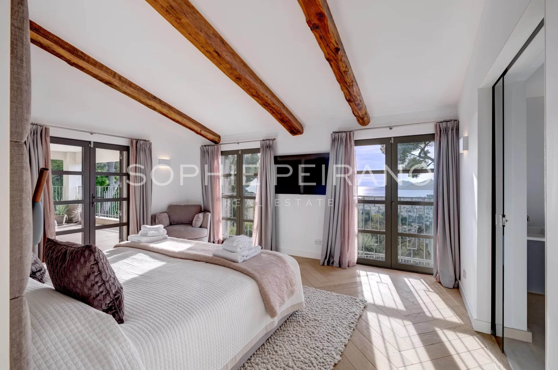 La propriété comprend cinq chambres en suite, dont une suite de maître située au dernier étage, disposant d’une salle de bain, d’un dressing et d’une grande terrasse.
