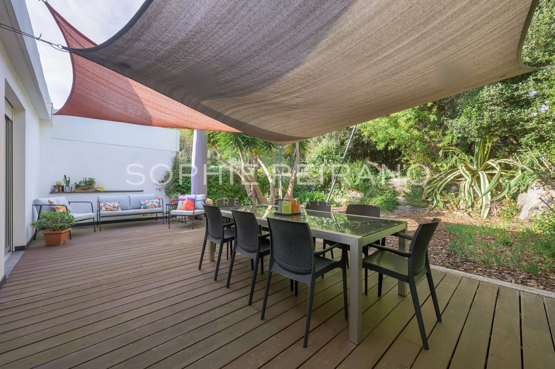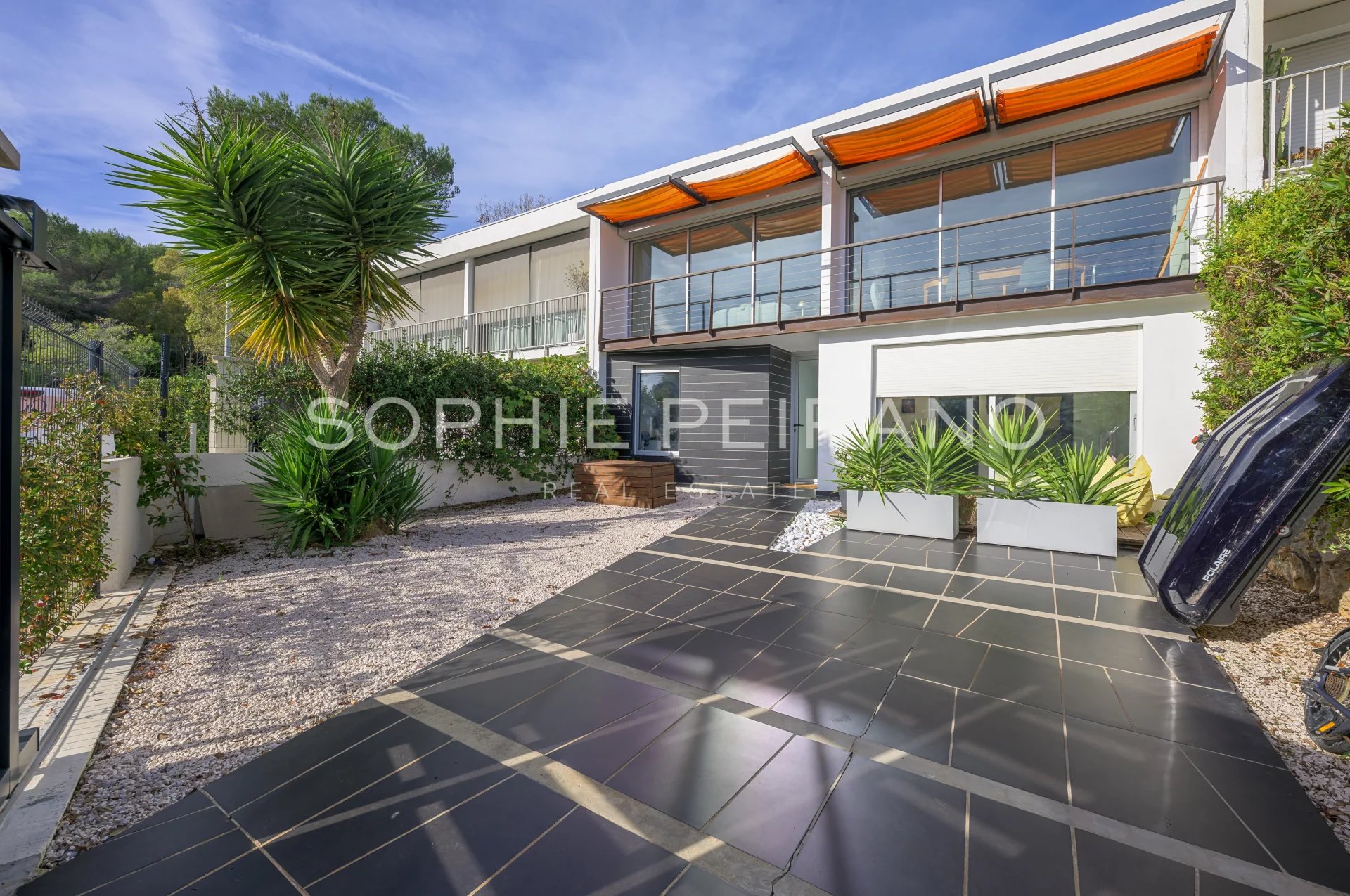 Située au calme absolu dans un domaine fermé et sécurisé avec piscine et tennis, cette maison de style californien d’environ 140 m² séduit par sa luminosité, sa vue mer et son cadre de vie serein.