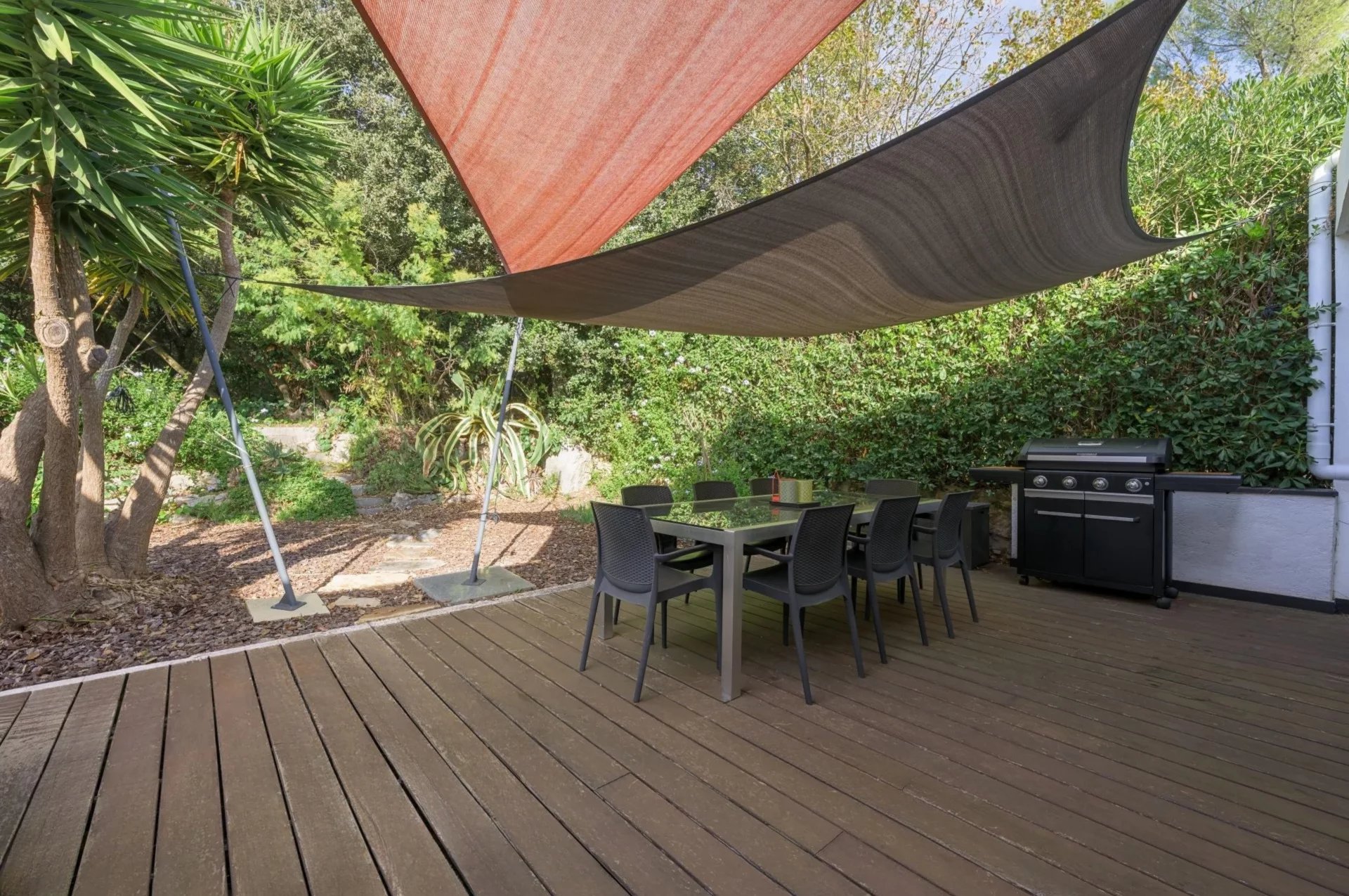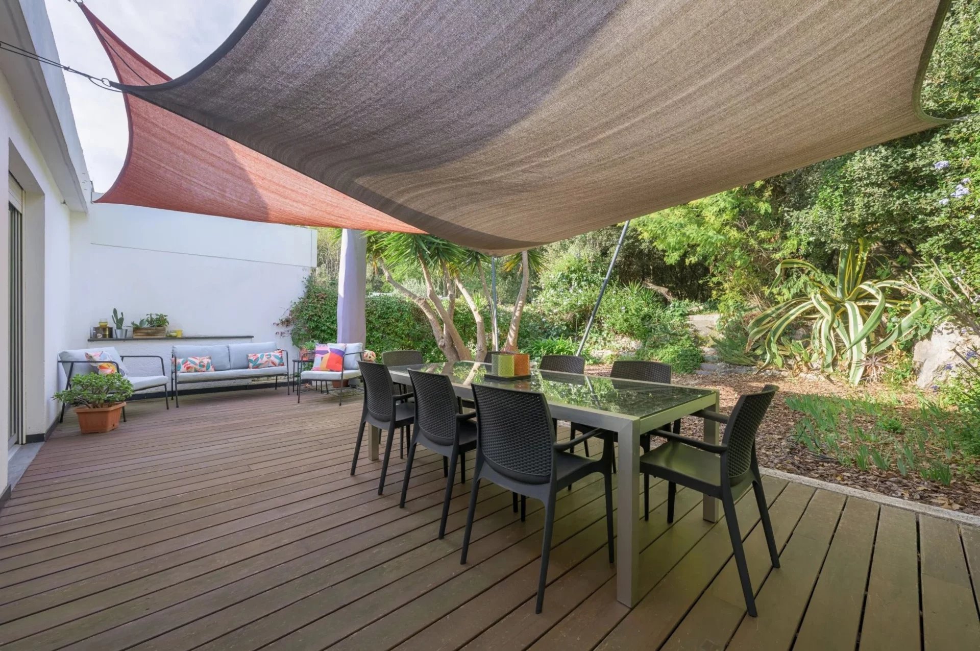 Le niveau principal offre un séjour lumineux ouvert sur la vue mer, une cuisine indépendante équipée et une chambre en suite donnant sur une grande terrasse prolongée par le jardin.